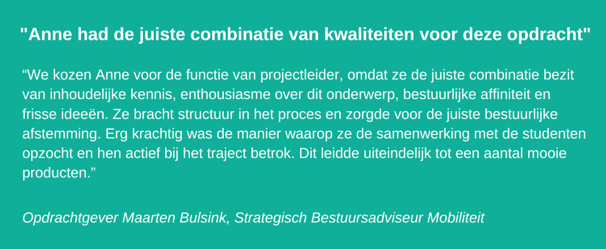 Anne ging met al deze partijen apart in gesprek. Ze wilde weten wat er bij hen speelt op het gebied van bereikbaarheid van scholen. Welke knelpunten ervaren ze? Welke belangen hebben de verschillende partijen bij een betere bereikbaarheid van de scholen? En nog belangrijker: wat zijn de gezamenlijke belangen? Er moet immers voldoende draagvlak zijn om deze opgave gezamenlijk aan te pakken.
